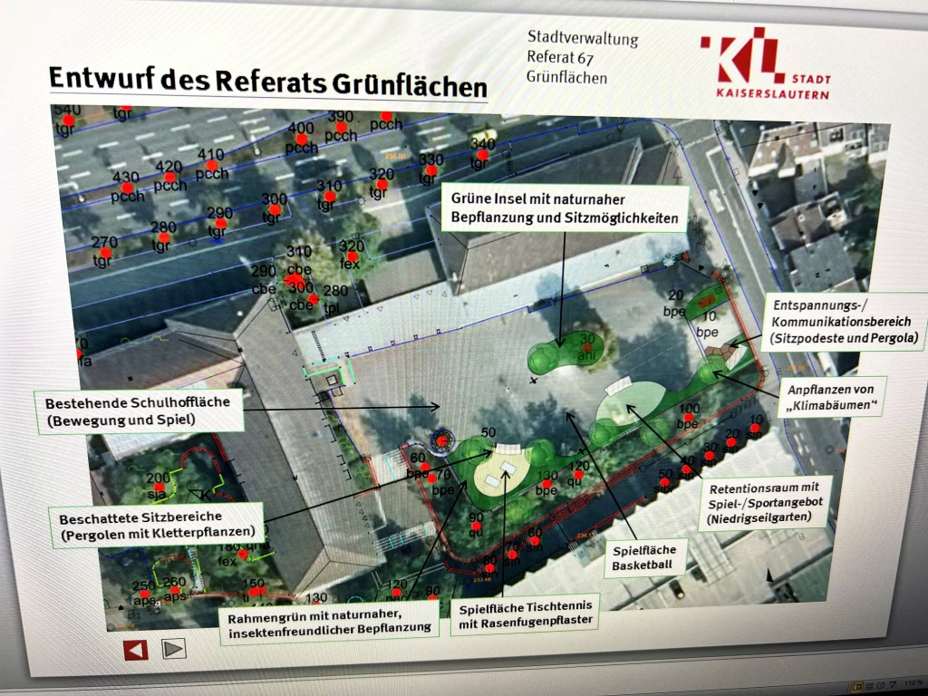 Ziel des Konzeptes, ist die Schaffung einer ökologisch wertvollen Fläche sowie Integration des Schulhofes in die urbane Umgebung. Es wurden viele Ideen, die die Schülerinnen und Schüler ausgearbeitet und vorgestellt hatten, eingearbeitet. „Auf der einen Seite sollt ihr mehr Platz im Schulhof bekommen, um euch auszutoben und zu spielen. Auf der anderen Seite wollen wir den Anteil der Grünflächen deutlich erhöhen“, berichtete Steiner den AG-Teilnehmenden. Der Entwurf sieht vor, dass circa 310 Quadratmeter befestigte Flächen entsiegelt und insektenfreundlich bepflanzt werden, weitere circa 85 Quadratmeter werden zu einer ganzflächigen Rasenfläche umgestaltet, ebenfalls 85 Quadratmeter mit Rasenfugenpflaster befestigt, um größere Entwässerungsmöglichkeiten bei Starkregenereignissen zu schaffen. Darüber hinaus sollen Pergolen mit Kletterpflanzen als Hitzeschutz eingebaut und Klimabäume gepflanzt werden. „Was wir mit den aktuellen Fördergeldern leider nicht realisieren können, sind die Fassaden- und die Dachbegrünung sowie der Aufbau eines Trinkbrunnens“, informiert Steinbrenner, sagte aber zu, dass das im Konzept für die weiteren Jahre fest verankert sei. Unterstützt werde die Initiative auch von mehreren Institutionen, Hochschulen und Behörden, darunter etwa das Umweltministerium in Mainz, die Bau AG oder die IHK Pfalz.