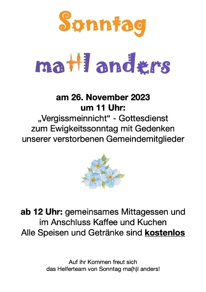 Um 11 Uhr findet ein Gottesdienst zum Ewigkeitssonntag mit Gedenken unserer verstorbenen Gemeindemitglieder statt. Das Thema des Gedenkgottesdienstes lautet „Vergissmeinnicht“. Eine vorherige Teilnahme am Gottesdienst ist – wie immer – natürlich nicht verpflichtend.