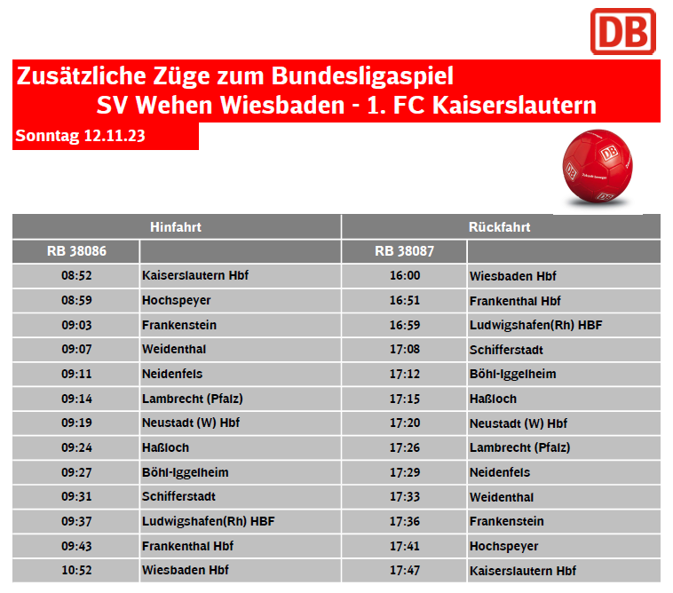 Am Sonntag, dem 12.11.2023, findet um 13:30 Uhr das Fußballspiel SV Wehen Wiesbaden – 1. FC Kaiserslautern statt. Um den Gästefans aus Kaiserslautern, Neustadt, Schifferstadt und Ludwigshafen eine sichere und bequeme An- und Abreise mit der Bahn zu ermöglichen, wird ein zusätzlicher Zug von Kaiserslautern Hbf nach Wiesebaden und wieder zurück angeboten.