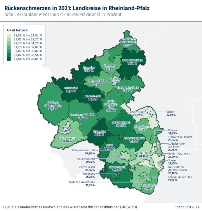 26,2 Millionen Patientinnen und Patienten in Deutschland waren 2021 mit Rückenbeschwerden in ärztlicher Behandlung – und damit fast ein Drittel der Bevölkerung (31,4 Prozent). Die Rheinland-Pfälzerinnen und Rheinland-Pfälzer liegen mit 31,2 Prozent der Bevölkerung etwa auf dem Bundesschnitt. Dies zeigt der aktuelle Gesundheitsatlas des Wissenschaftlichen Instituts der AOK (WIdO), der erstmals die regionale Verteilung von Rückenschmerzen bis auf die Ebene der Kreise und kreisfreien Städte transparent macht. Die niedrigsten Krankheitsraten gibt es laut Gesundheitsatlas für Rheinland-Pfalz mit je 22,8 Prozent in Mainz. Auf der anderen Seite des Spektrums steht der Landkreis Vulkaneifel mit 37,8 Prozent (Abbildung 1). Insgesamt sind 1.281.000 Menschen in Rheinland-Pfalz von Rückenschmerz betroffen.