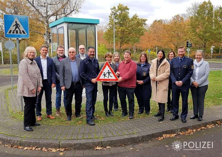 Im Rahmen einer kleinen Feierlichkeit wurde den Verkehrssicherheitsberatern von Vertretern der Kinderunfallkommission Kaiserslautern schon mal vorab symbolisch ein neues Verkehrszeichen als Geschenk überreicht. Das Foto zeigt die Gratulanten zusammen mit dem aktuellen Verkehrserzieher-Team Alexander Zapp, Tina Sornberger und Elke Berberich.