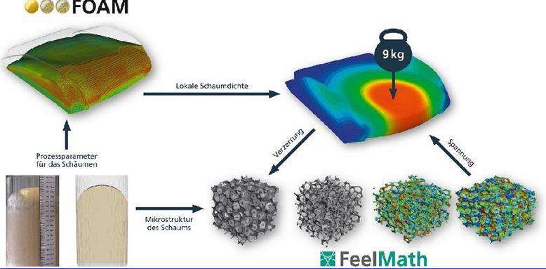 Der digitale Zwilling für Schaumstoff-Komponenten beginnt mit der Simulation des Aufschäumprozesses mit FOAM, um die lokale Dichte und Porengrößenverteilung des Schaumstoffbauteils zu bestimmen. Auf der Grundlage dieser Ergebnisse wird dann eine Schaumstoffdatenbank für verschiedene Dichten und Porengrößen dynamisch erstellt. Dieser Schritt stützt sich auf Mikrostruktursimulationen des Schaumes; diese wird mit dem ebenfalls am Fraunhofer ITWM entwickelten Tool FeelMath realisiert.