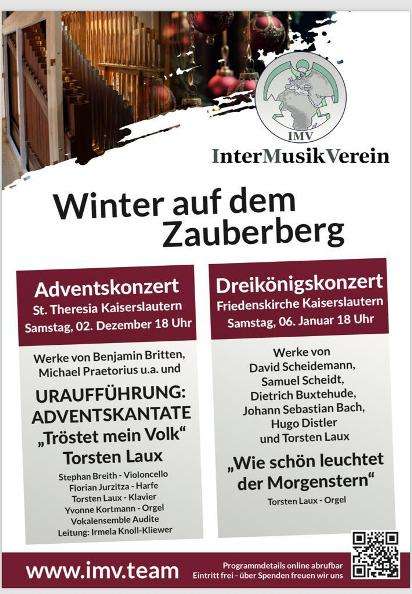 Am Vorabend zum 1. Advent, im Kerzenschein, laden Mitglieder des InterMusikVereins e.V. aus Kaiserslautern, Wiesbaden und Herne zu diesem besonderen Konzert mit der Uraufführung der Adventskantate ein. Es musizieren für Sie: Das Vokalensemble „Audite“ unter Leitung von Irmela Knoll-Kliewer, Florian Jurzitza, Harfe, Stefan Breith, Cello, Prof. Torsten Laux und Yvonne Kortmann, Orgel und Klavier. Freuen Sie sich darauf!