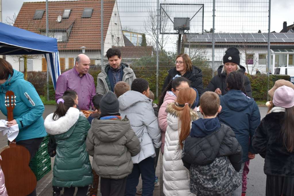 Das zweite Foto zeigt Manuel Steinbrenner und Daniela Günther beim Verteilen von Brezeln an die Kinder der Schillerschule, die zu Beginn des Richtfestes die Gäste mit einem Lied begrüßten.