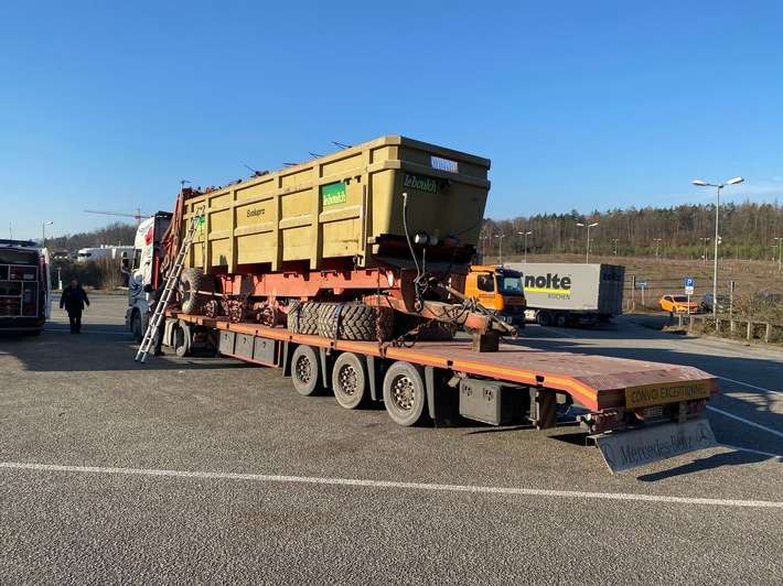 Am Mittwochvormittag fiel einer Streife der Schwerverkehrsüberwachung der Polizeidirektion Kaiserslautern ein Sattelzug ins Auge, der allem Anschein nach die erlaubte Höhe von 4,00 Metern deutlich überschritten hatte. Bei der anschließenden Kontrolle auf dem Parkplatz „Schweinsdell“ an der Anschlussstelle KL-Ost bestätigte sich die Annahme. In einem geladenen Anhänger befanden sich diverse Maschinenteile, die weit über die Bordwand des Anhängers herausragten. Letztendlich ergab die Vermessung eine tatsächliche Höhe von 4,53 m. Somit lag eine Überschreitung der Höhe von 53 cm vor. Die Weiterfahrt musste daher vor Ort untersagt werden. Der Fahrer muss eine Sicherheitsleistung hinterlegen. Gegen die Halterfirma wurde ebenfalls eine Anzeige erstattet und eine Vermögensabschöpfung im vierstelligen Bereich angeregt.