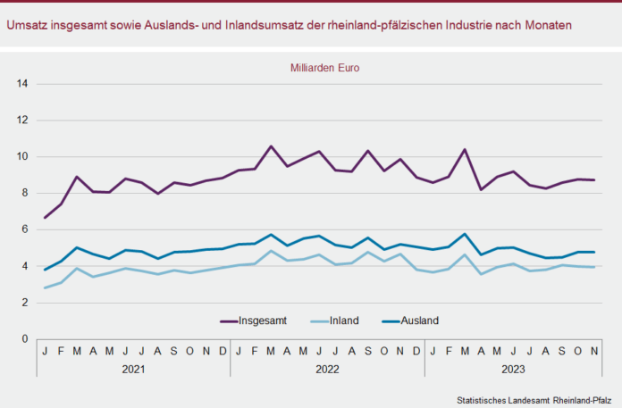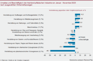 In den ersten elf Monaten 2023 lagen die Umsätze der rheinland-pfälzischen Industrie unter dem Niveau des Vorjahres. Nach Angaben des Statistischen Landesamtes in Bad Ems erwirtschafteten die Industriebetriebe von Januar bis November nominal 9,1 Prozent weniger Umsätze als im Vergleichszeitraum in 2022 – trotz des allgemein gestiegenen Preisniveaus (Deutschland: plus 1,4 Prozent).