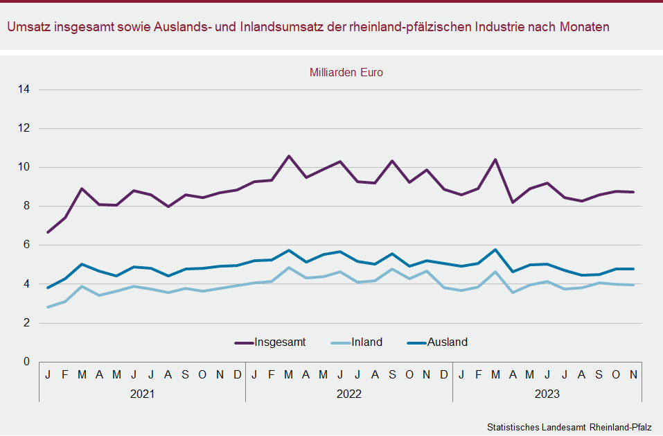 Im November lagen die Umsätze der Industriebetriebe bei 8,8 Milliarden Euro und damit um mehr als eine Milliarde bzw. zwölf Prozent unter dem Ergebnis des Vorjahresmonats. Die Inlandsnachfrage ging um 15 Prozent, die Auslandsnachfrage um 8,5 Prozent zurück. Deutschlandweit wurden 4,9 Prozent weniger Umsätze erzielt. Der Inlandsumsatz sank um 6,2 Prozent und der Auslandsumsatz um 3,7 Prozent.