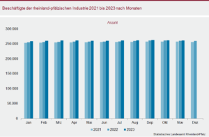 In den ersten elf Monaten 2023 waren durchschnittlich 261.000 Arbeitskräfte in der rheinland-pfälzischen Industrie beschäftigt. Das waren rund 2.700 mehr als im Vergleichszeitraum in 2022 (plus ein Prozent). Fünf der zehn umsatzstärksten Branchen verzeichneten eine höhere Beschäftigtenzahl. Die deutlichsten Zuwächse gab es bei den Herstellern von Kraftwagen und Kraftwagenteilen sowie im Maschinenbau (plus 4,8 bzw. plus 3,3 Prozent). Die Papier- und Pappehersteller reduzierten die Belegschaft dagegen um 5,4 Prozent.