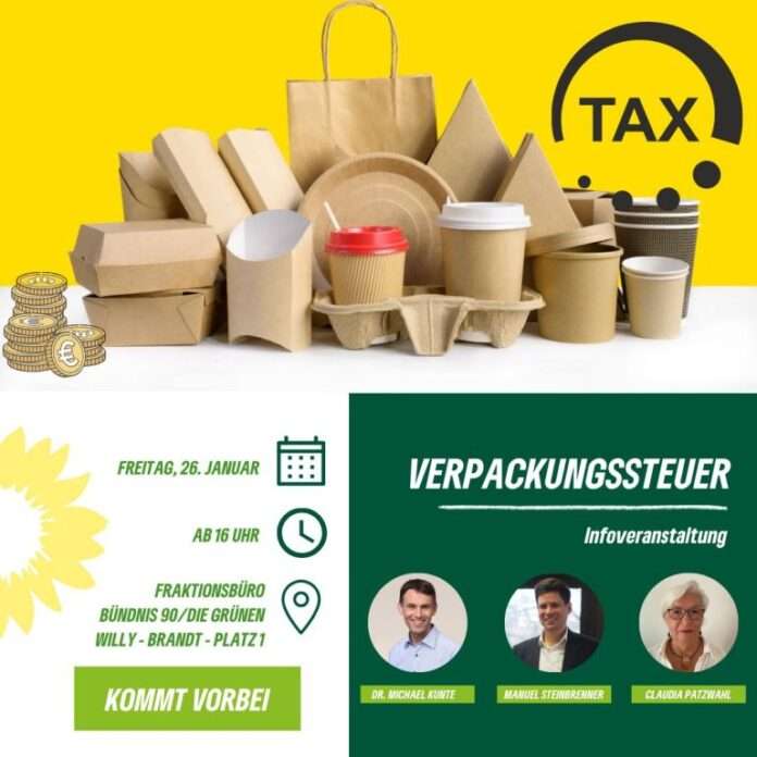 Die Stadtratsfraktion Bündnis 90 / Die Grünen lädt euch herzlich zu einem Vortrag von Tübinger Grüne Claudia Patzwahl mit anschließender Diskussionsrunde rund um die Verpackungssteuer am 26. Januar um 16 Uhr ein.