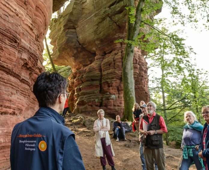 Von Februar bis April können sich Interessierte mit Vorkenntnissen im Bereich der Umweltbildung und Gästebetreuung zu Biosphären-Guides für das Biosphärenreservat Pfälzerwald weiterqualifizieren. In 48 Unterrichtsstunden in Form von Lerneinheiten und Exkursionen beschäftigen sich die Teilnehmenden intensiv mit den Landschafts- und Naturräumen sowie mit der Funktion des Biosphärenreservats als Modellregion der UNESCO für nachhaltige Entwicklung. Auf dem Programm, das sich vorrangig an bereits zertifizierte Natur- und Landschaftsführerinnen sowie Waldpädagogen richtet, stehen unter anderem die theoretische und praktische Auffrischung sowie ein Coaching zur Methodik nach Grundsätzen der Naturpädagogik und einer Bildung für nachhaltige Entwicklung (BNE).