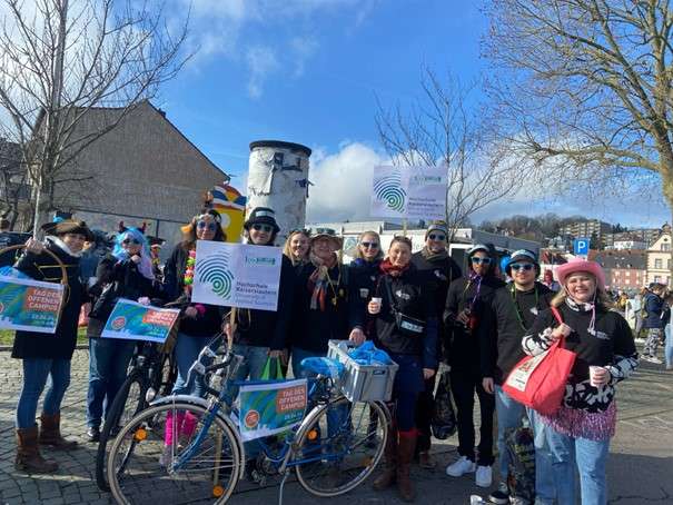 Der Hochschulstandort hat mit insgesamt 12 Närrinnen und Narren und zwei Fahrrädern teilgenommen. Passend zum Anlass hatten die närrischen Vertreter*innen des Hochschulstandorts die Fahrradsättel mit dem Aufdruck „Komm trocken durch dein Studium“ versehen sowie großzügig Gummibärchen und Kamelle unter dem zahlreichen Publikum verteilt. Highlight war das Finale des Umzugs, der mit dem der Einmarsch aller Zugnummern im Zentralen Omnibus-Bahnhof endete.