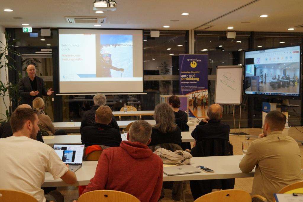 Dr. Wolfgang Franz informiert beim Sportbund Pfalz über die Behandlung chronischer Kniebeschwerden mit Hilfe körpereigener Heilungskräfte