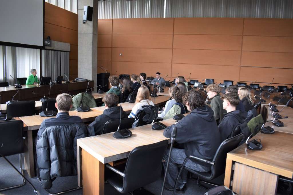 Das war eine ungewöhnliche Doppelstunde für den 13er Sozialkunde-Leistungskurs des Gymnasiums am Rittersberg, der vor kurzem seine schriftliche Abiturprüfung abgelegt hat. Zum Abschluss des Kurses hatte Lehrer Hendrik Trahmer die Idee, eine Exkursion ins Rathaus zu machen, um dem Kurs noch einmal die Bedeutung politischer Organe vor Ort zu verdeutlichen und auch Einblicke in das Tätigkeits- und Aufgabenfeld der Kommunalpolitik zu geben. Empfangen wurde die Gruppe am „Ort des Geschehens“ im Großen Ratssaal von Oberbürgermeisterin Beate Kimmel, die sich gerne die Zeit nahm, den Kurs persönlich willkommen zu heißen und sich 90 Minuten lang mit Fragen löchern zu lassen – zu Ihrem Werdegang, zum Amt der Oberbürgermeisterin, aber auch zu aktuellen politischen Themen.