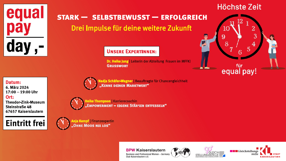 Am 6. März 2024 lädt das Equal Pay Day Bündnis, bestehend aus den Gleichstellungsstellen von Landkreis und Stadt Kaiserslautern und der 1. Vorsitzenden des BPW Germany Club Kaiserslautern e.V., zu einer besonderen Veranstaltung im Rahmen des Equal Pay Day ein. Sie richtet sich insbesondere an Frauen, die ihre berufliche Entwicklung vorantreiben wollen. Unter dem motivierenden Motto „stark, selbstbewusst, erfolgreich“ bietet die Veranstaltung eine inspirierende Plattform für den Austausch von Erfahrungen, Wissen und Ressourcen.