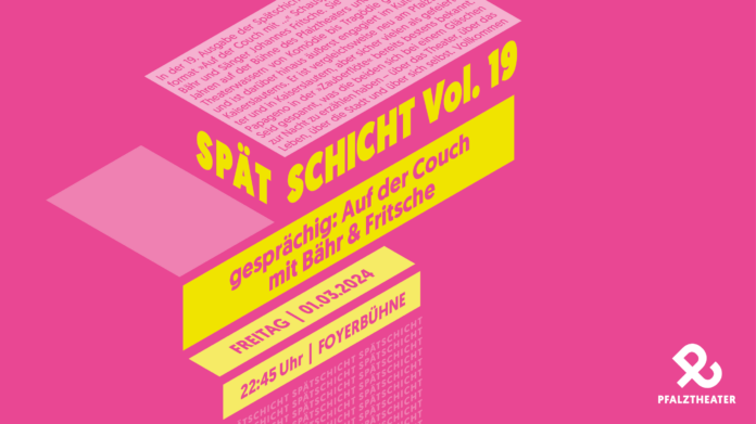 In der 19. Ausgabe der Spätschicht treffen sich im Talkformat »Auf der Couch mit …« Schauspielerin Hannelore Bähr und Sänger Johannes Fritsche. Sie steht seit vielen Jahren auf der Bühne des Pfalztheaters und ist mit allen Theaterwassern von Komödie bis Tragödie gewaschen und ist darüber hinaus äußerst engagiert im Kulturleben Kaiserslauterns. Er ist vergleichsweise neu am Pfalztheater und in Kaiserslautern, aber sicher vielen als gefeierter Papageno in der »Zauberflöte« bereits bestens bekannt. Seid gespannt, was die beiden sich bei einem Gläschen zur Nacht zu erzählen haben – über das Theater, über das Leben, über die Stadt und über sich selbst. Vollkommen spontan und persönlich!