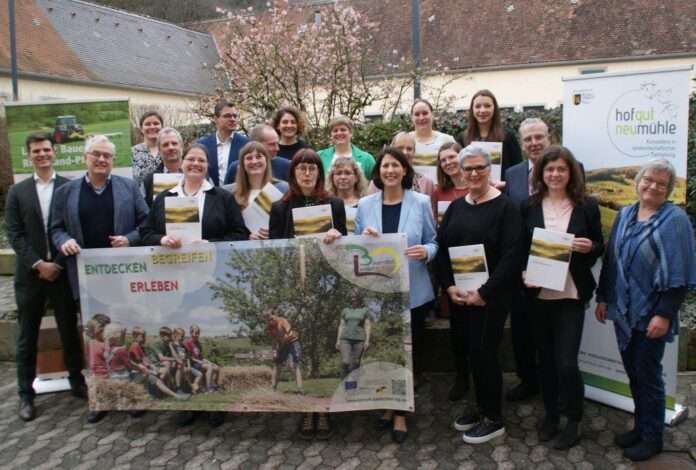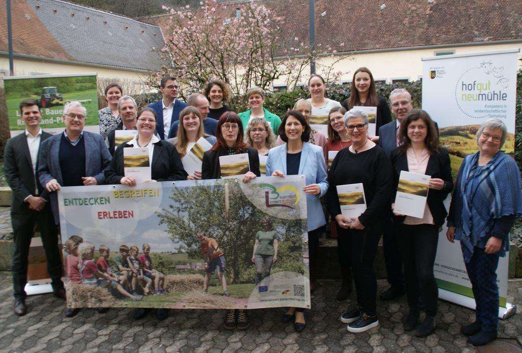 Kindern und Jugendlichen die Landwirtschaft näherbringen – darum geht es beim „Lernort Bauernhof“. Landwirtinnen und Landwirte können sich zu Bauernhofpädagoginnen und -pädagogen weiterbilden lassen und am eigenen Hof Schulklassen zeigen, was ein Landwirt beziehungsweise eine Landwirtin Tag für Tag macht. Im Hofgut Neumühle bei Münchweiler an der Alsenz konnten nun 14 frischgebackene Bauernhofpädagoginnen und -pädagogen, darunter drei Beschäftigte des Hofguts Neumühle, ihr Zertifikat aus der Hand von Ministerin Daniela Schmitt vom Ministerium für Wirtschaft, Verkehr, Landwirtschaft und Weinbau entgegennehmen.