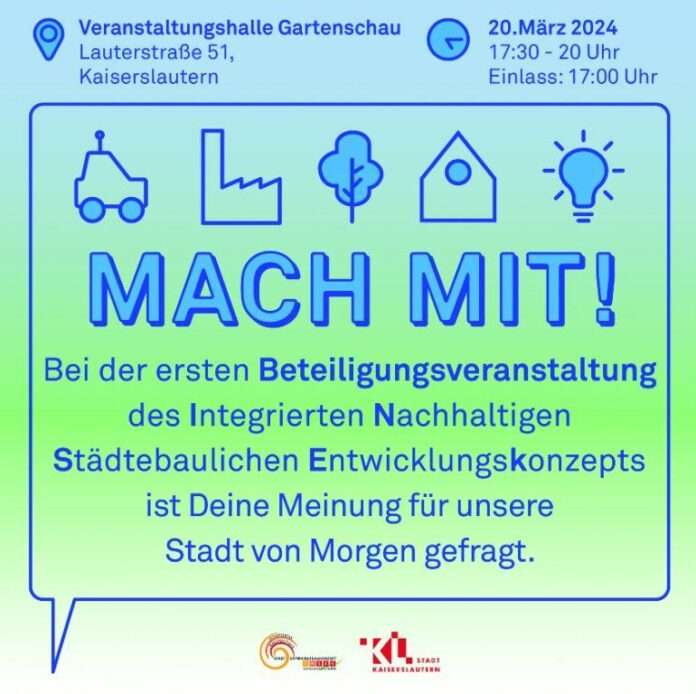 Am Mittwoch, den 20. März, lädt die Stadt Kaiserslautern von 17.30 bis 20.00 Uhr alle interessierten Bürgerinnen und Bürger herzlich zur öffentlichen Auftaktveranstaltung in die Veranstaltungshalle auf dem Gartenschaugelände (Forellenstraße 1) ein. Das Planungsteam stellt erste Arbeitsergebnisse des INSEKs vor und informiert über die weiteren Verfahrensschritte und Beteiligungsmöglichkeiten. Ergänzend geben lokale Experten Kurzbeiträge zu relevanten Planungsthemen. Die Teilnehmerinnen und Teilnehmer haben die Möglichkeit, ihre Meinung zu konkreten Stadtentwicklungsthemen zu äußern.