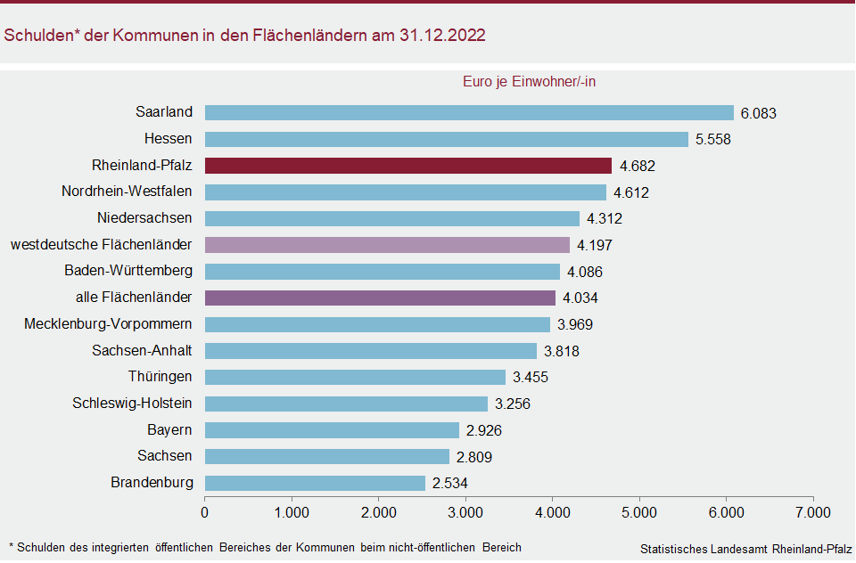 Eine höhere durchschnittliche Verschuldung als in Rheinland-Pfalz wurden für die Kommunen im Saarland (6.083 Euro) und in Hessen (5.558 Euro) ermittelt. Diese und weitere Ergebnisse gehen aus der Modellrechnung der so genannten „Integrierten Schulden“ hervor, die die Statistischen Ämter des Bundes und der Länder jetzt vorlegen.