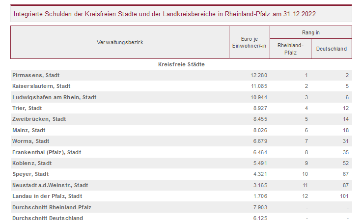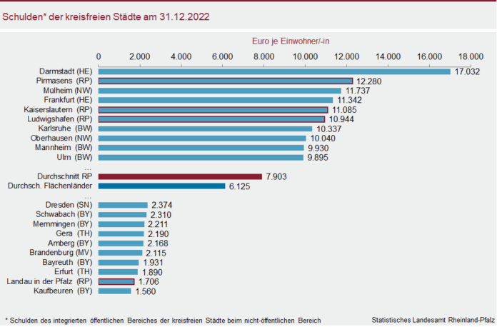 In Rheinland-Pfalz zeigen sich deutliche Unterschiede zwischen den kreisfreien Städten und den Landkreisbereichen. Die kreisfreien Städte in Rheinland-Pfalz haben durchschnittlich 7.903 Euro Schulden je Einwohnerin bzw. Einwohner – das sind 29 Prozent mehr als der Durchschnitt aller Flächenländer (6.125 EUR). Von den Top Ten der am höchsten verschuldeten kreisfreien Städte in Deutschland kommen Ende 2022 drei aus Rheinland-Pfalz. Mit 12.280 Euro weist Pirmasens die zweithöchste Verschuldung unter den kreisfreien Städten auf. Mit dem fünft- bzw. sechsthöchsten Wert folgen Kaiserslautern (11.085 Euro) sowie Ludwigshafen (10.944 Euro). Unter den zehn am wenigsten verschuldeten kreisfreien Städten findet sich eine Stadt aus Rheinland-Pfalz: Landau in der Pfalz hat bundesweit die zweitniedrigste Verschuldung (1.706 Euro).