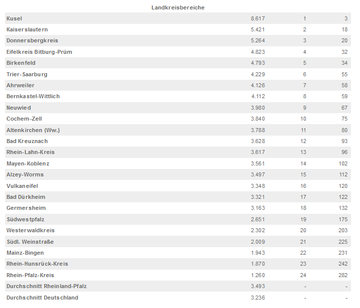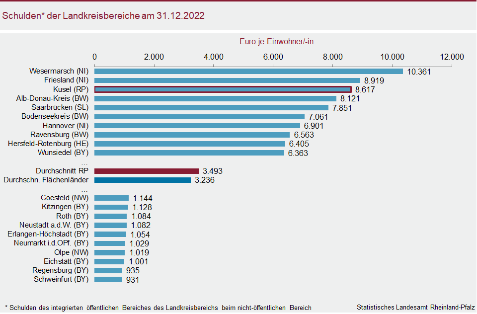 Der rheinland-pfälzische Landkreisbereich liegt mit 3.493 Euro je Einwohnerin bzw. Einwohner acht Prozent über den Durchschnitt aller Flächenländer (3.236 EUR). Der Landkreisbereich ist die Summe aus den Landkreisen sowie der zu dem Landkreis gehörenden Kommunen; in Rheinland-Pfalz sind das die Verbandsgemeinden mit ihren Ortsgemeinden sowie die verbandsfreien Gemeinden. Rheinland-Pfalz ist unter den zehn Landkreisbereichen mit der höchsten Verschuldung in Deutschland mit Kusel (8.617 EUR je Einwohnerin bzw. Einwohner) auf dem dritten Platz vertreten. Der niedrigste Wert für Rheinland-Pfalz wurde für den Rhein-Pfalz-Kreis mit 1.260 Euro ermittelt. Lediglich zwölf Landkreisbereiche in ganz Deutschland kommen auf eine niedrigere Verschuldung je Einwohnerin bzw. Einwohner. Die zehn am wenigsten verschuldeten Landkreisbereiche stammen überwiegend aus Bayern.