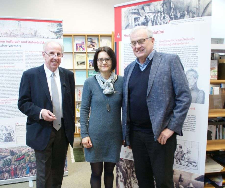 „Ich freue mich, dass die Ausstellung so großes Interesse findet“, sagte Bezirkstagsvorsitzender Theo Wieder bei der Eröffnung der Schau „…überall weht die schwarz roth goldene Freiheitsfahne“ zur Pfälzischen Revolution 1848/49 in der voll besetzten Pfalzbibliothek Kaiserslautern. Dies sei „ein ganz zentrales Thema unserer Gesellschaft und vielleicht auch unserer Gegenwart“. Vormärz und Revolution seien Wesenselemente der deutschen Demokratie gewesen. „Wir stehen heute wieder in der Situation, dass wir uns ernsthaft Gedanken über unsere Demokratie machen müssen“, so Wieder. Und er mahnte: „Sie ist kein Selbstläufer, sondern muss immer wieder erneuert werden.“ Daher sei es wichtig, wählen zu gehen. Er wies auch auf die Bedeutung der Farben schwarz-rot-gold der deutschen Flagge hin: Das Schwarz stehe für die dunkle Nacht der Besatzungszeit, das Rot für das Blut, das für die Befreiung vergossen worden sei, und das Gold für die Morgenröte am Horizont.