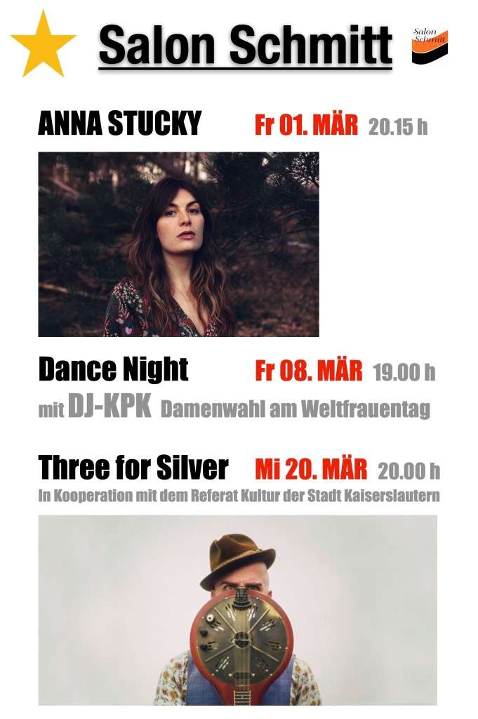 Der März ist bereits in vollem Gange und das erste Event vergangenen Freitag über die Bühne mit Anna Stucky und ausverkauftem Haus ! Ein wunderbarer Abend. Auch kommenden Freitag dem 08. März Weltfrauentag ist der Salon geöffnet und DJ KPK legt unter dem Motto Damenwahl wieder für Euch auf … Geöffnet ist ab 18.00h !!!Am 20. März dann die US Amerikanische Band „ Three for Silver „ in Kooperation mitdem Referat Kultur unserer Stadt. Doomed Folk vom Aller-Feinsten!!Es ist ein Mittwoch und das Konzert beginnt bereits um 20.00h – Einlass 19.00h.Der VVK hierfür läuft , wie auch für die Konzerte im April wo wir gleich an drei Wochenenden live Musik haben.