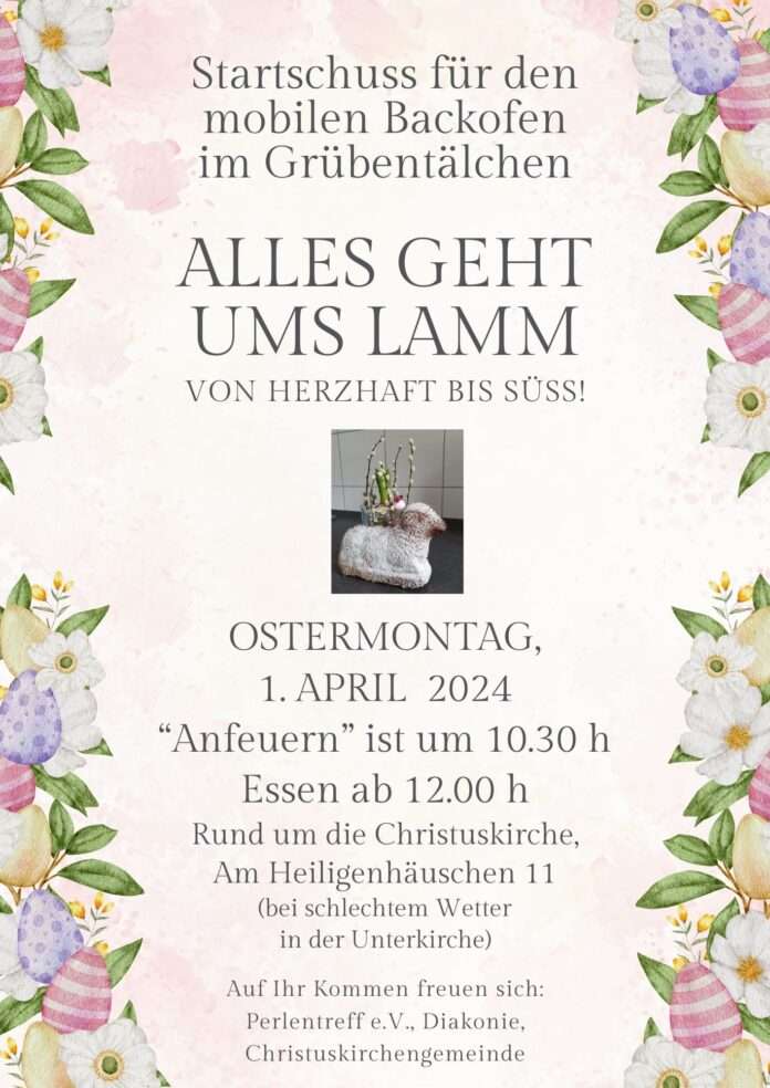 Die Auftaktveranstaltung findet am 1. April 2024 (Ostermontag) zum Thema „Alles geht ums Lamm“ rund um die Christuskirche, Am Heiligenhäuschen 11, 67657 Kaiserslautern statt. Falls das Wetter am 1. April „verrückt spielen“ sollte, wird die Veranstaltung in die Unterkirche der Christuskirche verlegt. Los geht es an diesem Tag um 10.30 Uhr mit dem Anfeuern des Backofens. Ab 12 Uhr wird es dann ein leckeres kostenloses Mittagessen mit Pide und einem herzhaften Lammgericht mit Gemüse und Reis geben. Im Anschluss werden Osterlämmer gebacken und dann zusammen mit Kaffee verspeist. Auf Ihr Kommen freuen sich: Der Perlentreff e.V., Diakonie-Pfalz und die Christuskirchengemeinde.