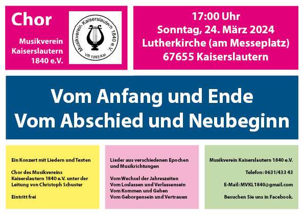 Jeder Abschied tut weh – Jedem Anfang wohnt ein Zauber inne. Diesen Emotionen haben Musiker in verschiedenen Epochen Ausdruck verliehen. Im Konzert des Musikvereins Kaiserslautern 1840 e.V. unter der Leitung von Christoph Schuster begegnen Sie einer Auswahl von Liedern zu diesen Themen aus verschiedenen Epochen und Musikrichtungen: von Barock bis Modern – von Klassik über Light Music bis Gospel und Pop. Die Lieder und Songs erzählen vom Wechsel der Jahreszeiten, vom Loslassen und Verlassensein, vom Kommen und Gehen und vom Geborgensein und Vertrauen. Die Liedvorträge werden begleitet von Texten. Genießen Sie diese Begegnung mit Musik und, wenn Sie mögen, stimmen Sie am Ende mit ein in das Lied „Der Mond ist aufgegangen“.