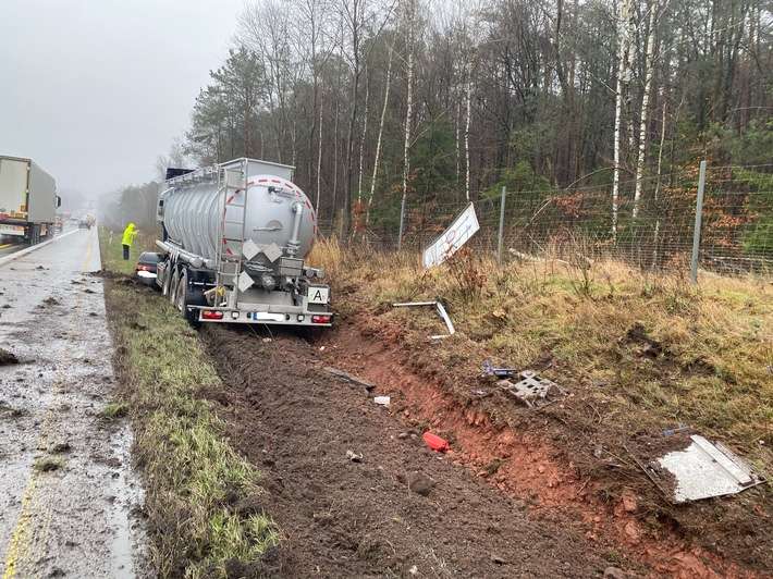 Am Mittwochmorgen kam es im Baustellenbereich zwischen den Anschlussstellen KL-Ost und Enkenbach zu einem folgenschweren Ausweichmanöver. Um einem Überholenden Platz zu machen, zog ein 35-Jähriger Sattelzug-Fahrer etwas zu weit nach rechts und kam dabei von der Fahrbahn ab. Der Sattelzug fuhr in den Grünstreifen und kam dort im aufgeweichten Erdreich zum Stehen. Der Fahrer hatte Glück im Unglück und blieb unverletzt. Da der Sattelzug in seinem Tankauflieger 29.000 Liter einer Abfallflüssigkeit (kein Gefahrgut) geladen hatte, musste zunächst das Gewicht reduziert werden bevor eine Bergung möglich war. Hierzu wurde eine Entsorgungsfirma beauftragt. Zum Umpumpen der geladenen Flüssigkeit sowie anschließenden Bergung war die Autobahn in Richtung Mannheim für die Dauer von ca. 3 Stunden voll gesperrt. Der Verkehr wurde an der Anschlussstelle Kl-Ost abgeleitet. Es kam zweitweise zu erheblichen Rückstaus. An dem Sattelzug entstand ein Schaden in Höhe von ca. 50000 Euro.