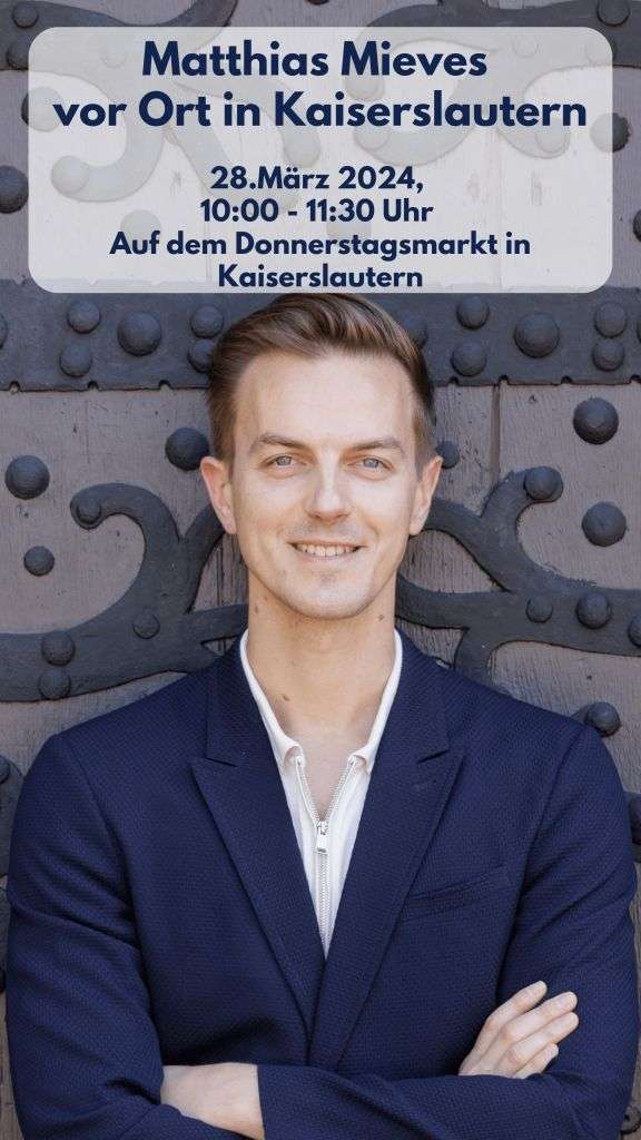 Der Bundestagsabgeordnete Matthias Mieves ist im Wahlkreis unterwegs und wird am 28.März 2024 zwischen 10:00 – 11:30 Uhr auf dem Donnerstagsmarkt in Kaiserslautern vor Ort sein. Interessierte sind herzlich eingeladen.