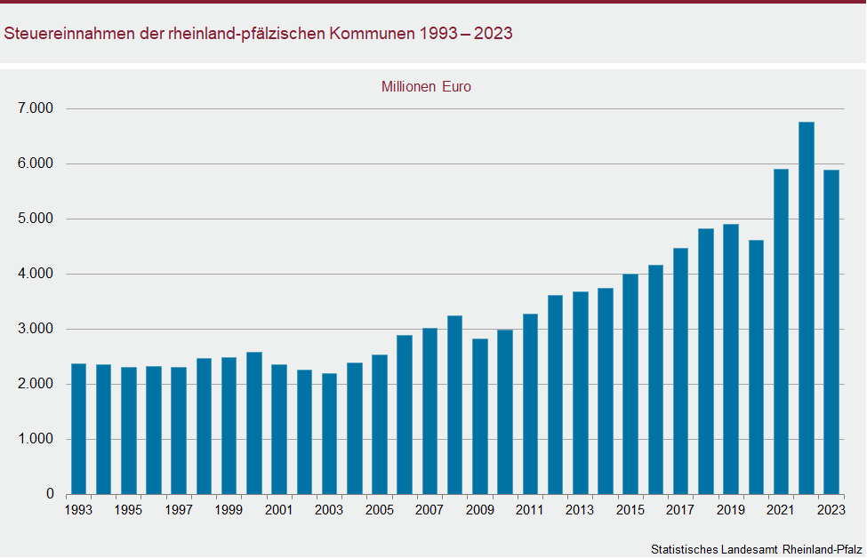 Die kassenmäßigen Steuereinnahmen der rheinland-pfälzischen Kommunen für das Jahr 2023 betrugen insgesamt knapp 5,9 Milliarden Euro. Wie das Statistische Landesamt auf Basis vorläufiger Zahlen aus der amtlichen Kassenstatistik mitteilt, sind das rund 864 Millionen Euro bzw. 13 Prozent weniger als im Jahr 2022. Im Vergleich zu 2013 stiegen die Steuereinnahmen hingegen um rund 60 Prozent.