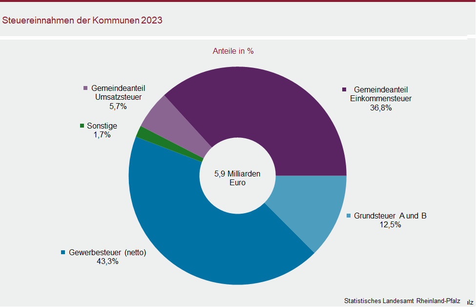 Die Einnahmen aus den Grundsteuern A und B stiegen über alle rheinland-pfälzischen Kommunen hinweg gegenüber dem Vorjahr um circa 72 Millionen Euro bzw. elf Prozent auf knapp 740 Millionen Euro. Insgesamt entfielen damit 56 Prozent der Steuereinnahmen auf die Realsteuern (2022: 63 Prozent).