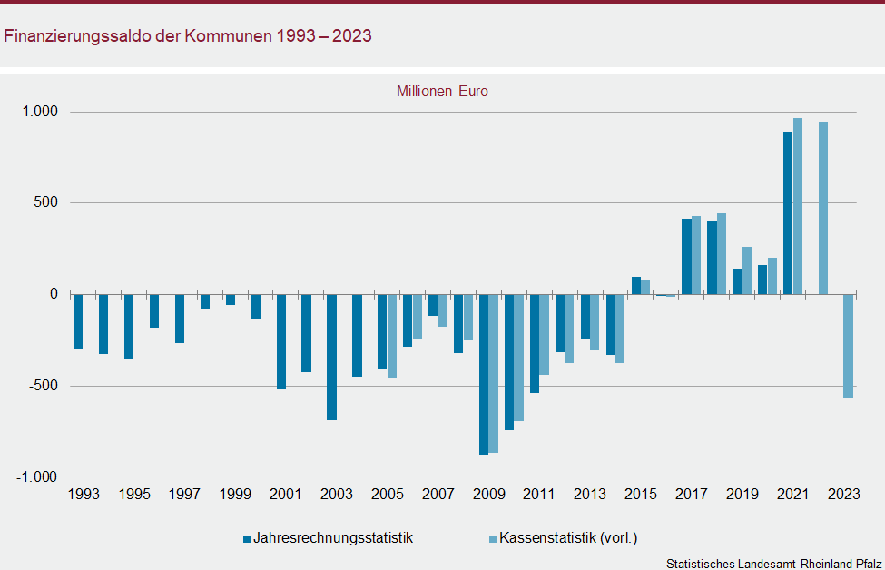 Prägend für die Entwicklung des Finanzierungssaldos war die Situation in der Stadt Mainz: Alleine hier fiel der Saldo von einem Überschuss von gut 767 Millionen Euro im Jahr 2022 um rund 1,2 Milliarden Euro auf ein Minus von nun 440 Millionen Euro.