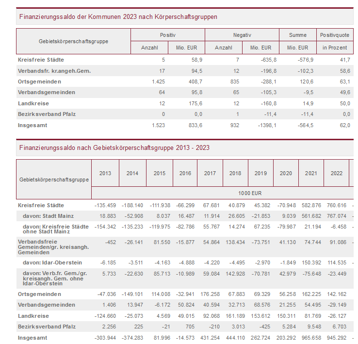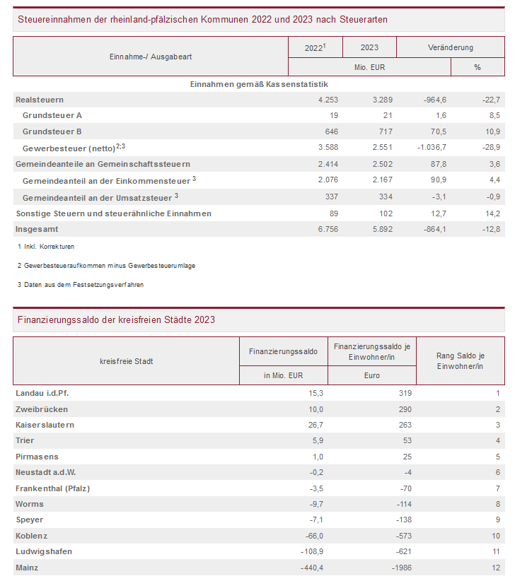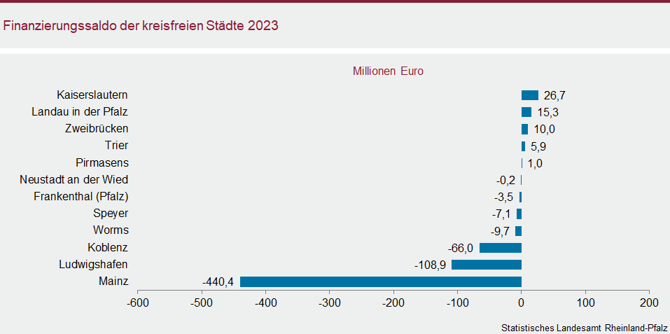 Von den zwölf kreisfreien Städten hatten fünf einen positiven Saldo. Den höchsten Überschuss wies im Jahr 2023 die Stadt Kaiserslautern mit einem Plus von 26,7 Millionen Euro aus. Der höchste positive Pro-Kopf-Saldo findet sich hingegen mit 319 Euro je Einwohnerin bzw. Einwohner in der Stadt Landau. Am anderen Ende der Skala steht – u.a. aufgrund der stark rückläufigen Gewerbesteuereinnahmen – die Stadt Mainz (minus 440 Millionen Euro bzw. minus 1.986 Euro je Einwohnerin bzw. Einwohner).
