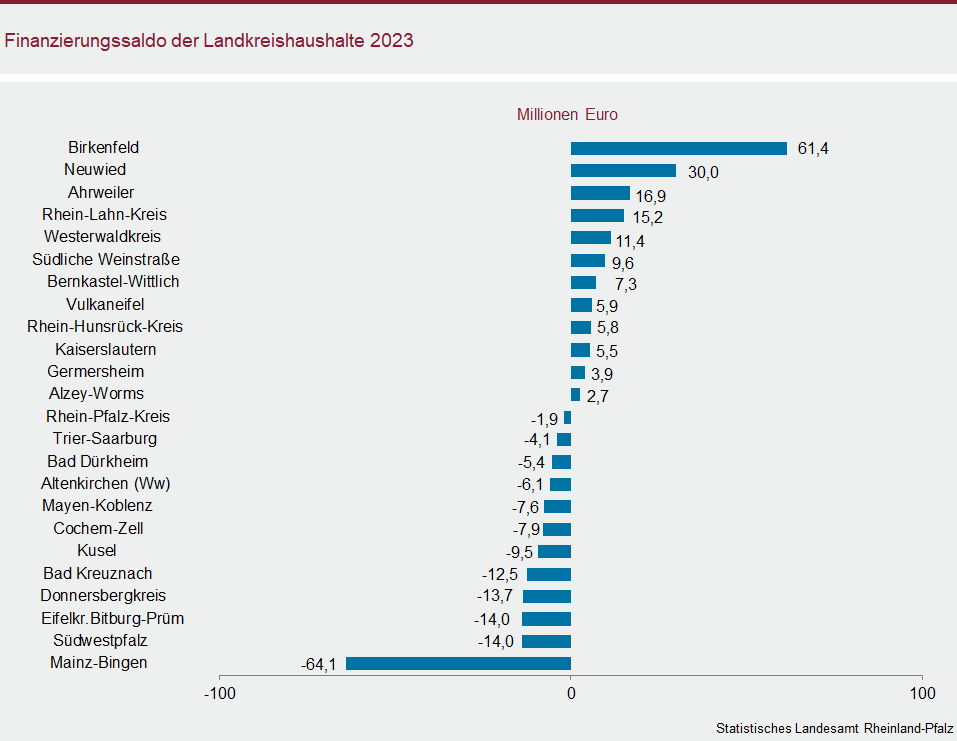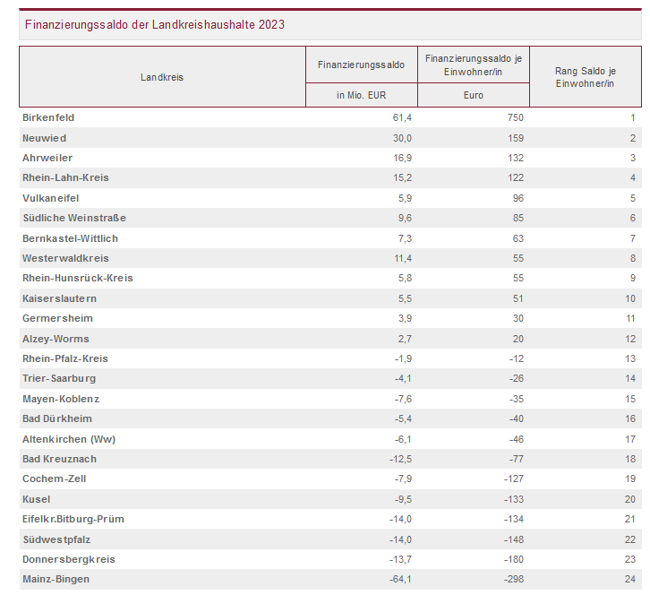 Von den 24 Landkreishaushalten schloss im vergangenen Jahr die Hälfte mit einem Überschuss ab. Sowohl absolut (61,4 Millionen Euro) als auch in der relativen Betrachtung (750 Euro je Einwohnerin bzw. Einwohner) wies der Landkreis Birkenfeld den höchsten positiven Saldo auf. Der höchste negative Finanzierungssaldo war im Landkreis Mainz-Bingen (minus 64,1 Millionen Euro bzw. minus 298 Euro je Einwohnerin bzw. je Einwohner) zu beobachten.