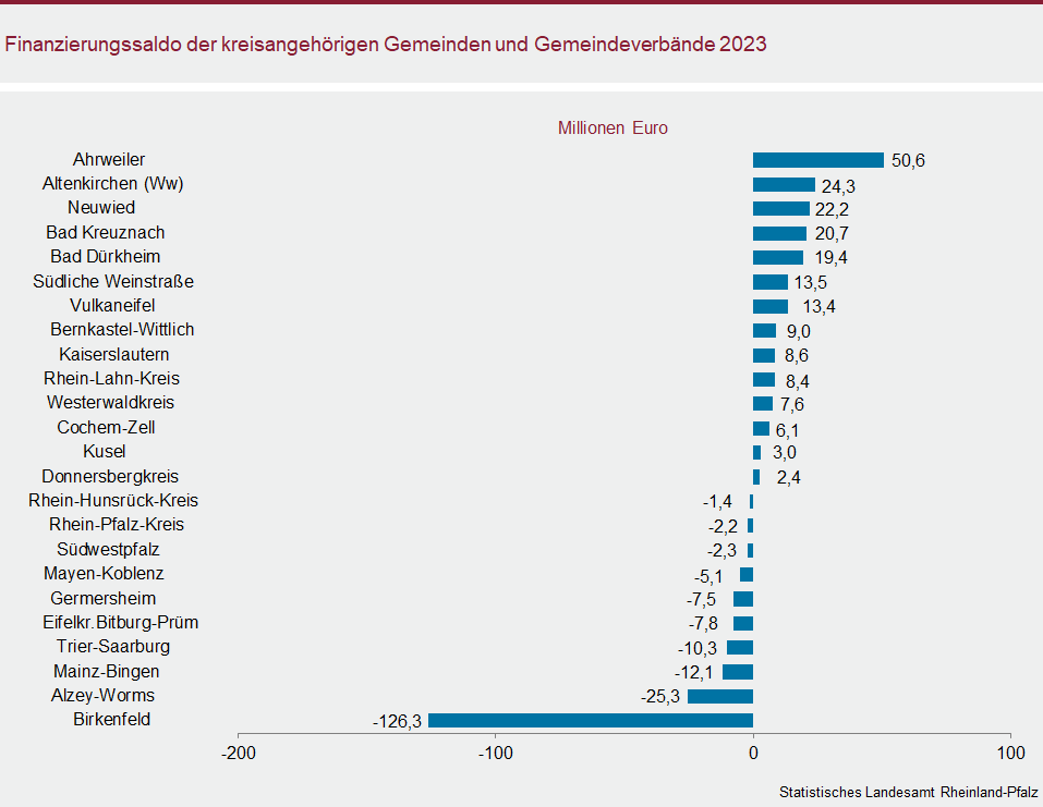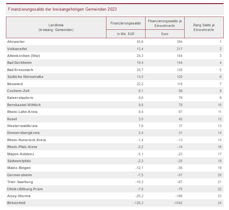 Von allen kreisangehörigen Kommunen (Ortsgemeinden, verbandsfreie kreisangehörige Gemeinden und Verbandsgemeinden) in Rheinland-Pfalz erzielten 1.506 (62 Prozent) einen Überschuss. Auf dieser Haushaltsebene wurde sowohl absolut als auch relativ bei den Kommunen des Landkreis Ahrweiler der höchste Wert festgestellt. Für alle Kommunen des Landkreises errechnet sich ein positiver Finanzierungssaldo in Höhe von 50,6 Millionen Euro bzw. 394 Euro je Einwohnerin bzw. je Einwohner. Die höchsten negativen Salden wiesen die Städte und Gemeinden im Landkreis Birkenfeld auf. Der Fehlbetrag lag hier bei 126,3 Millionen Euro sowie einwohnerbezogen bei 1.542 Euro. Hier ist der Negativsaldo der Stadt Idar-Oberstein in Höhe von 134,1 Millionen Euro maßgebend, während die restlichen Kommunen des Landkreises – separat betrachtet – das Jahr 2023 zusammen mit einem positiven Saldo von 7,8 Millionen Euro abschlossen.