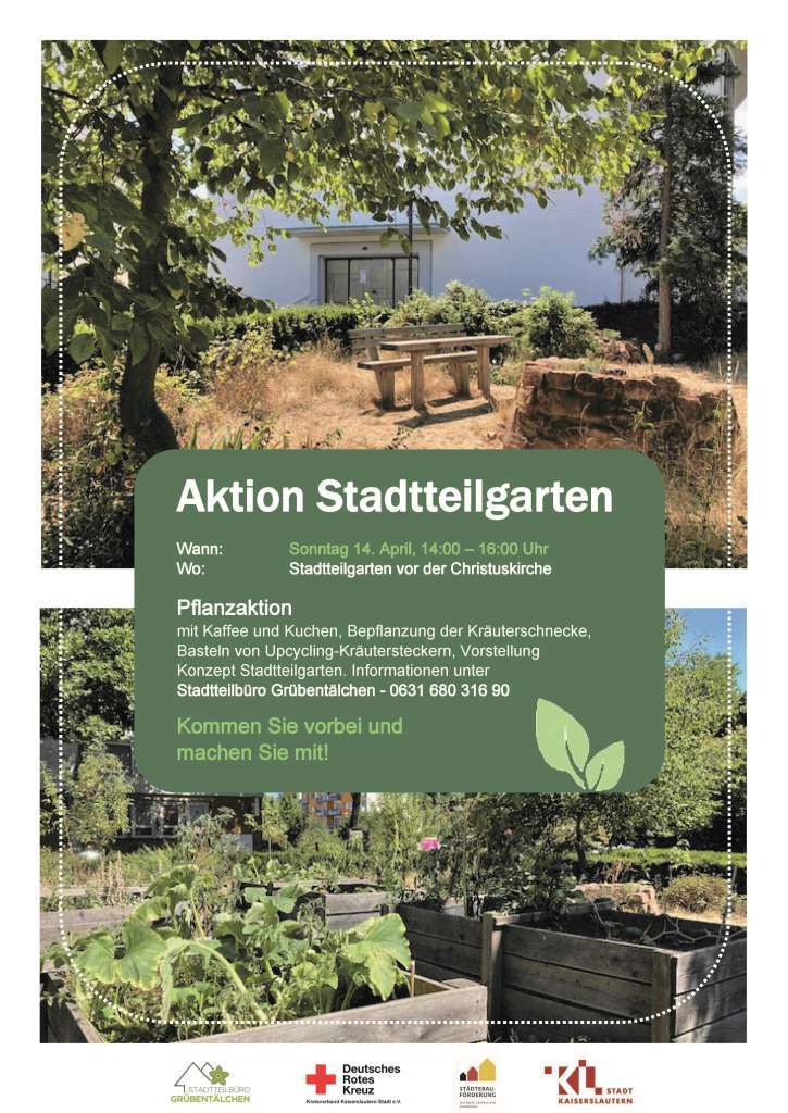 Das Stadtteilbüro Grübentälchen (Tel 0631 680 316 90) lädt am Sonntag, den 14. April, von 14:00 – 16:00 Uhr ein in den Stadtteilgarten vor der Christuskirche in der Tirolfstraße.