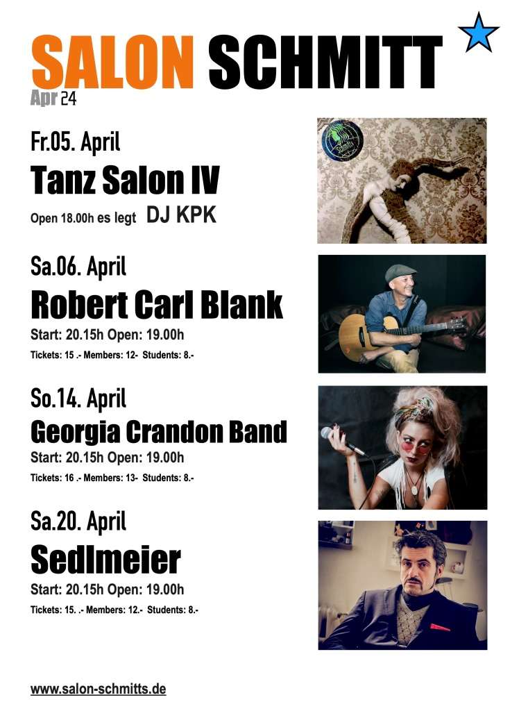 Start: 20.15h open: 19.00h. Tickets: www.salon-schmitts.de