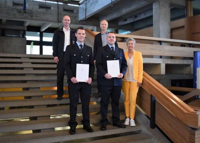 „Ich gratuliere Ihnen ganz herzlich zu Ihrer Verbeamtung auf Lebenszeit“, so die Oberbürgermeisterin. „Die Ernennung zu Lebenszeitbeamten ist etwas ganz Besonderes, eine Statusfestigung und eine wichtige Voraussetzung für die weitere Beamtenlaufbahn.“ Darüber hinaus zollte Kimmel den beiden jungen Kollegen Respekt, dass sie bereit seien, sich selbst in Gefahr zu begeben, um das Leben anderer zu retten. Sie wünschte weiterhin viel Erfolg und alles Gute für die Zukunft.
