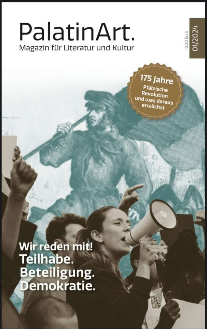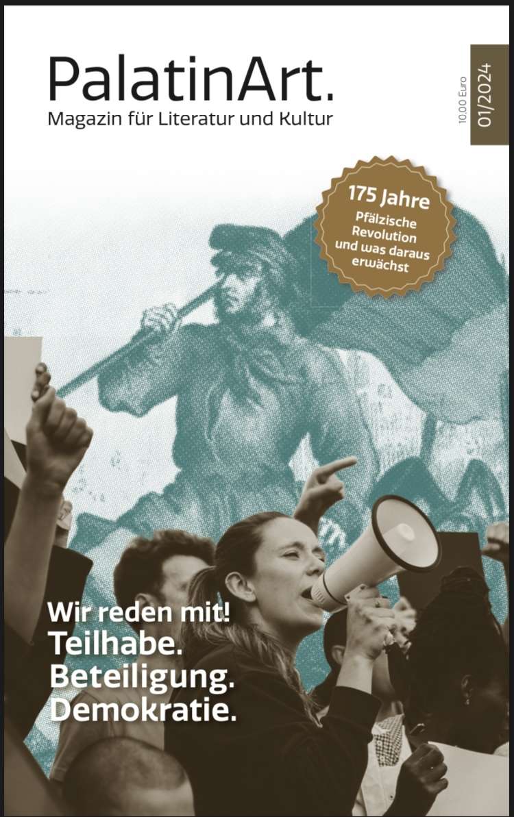 Die kürzlich erschienene Erstausgabe der „PalatinArt. Magazin für Literatur und Kultur der Pfalz“ wird am Samstag, 20. April, um 11 Uhr in der Pfalzbibliothek Kaiserslautern, Bismarckstraße 17, präsentiert (Parken im Hof möglich). Das Publikum kann sich auf Autorenlesungen, Musik und Gespräche freuen. Die Ausgabe beschäftigt sich im Schwerpunkt mit der Pfälzischen Revolution von 1848/49 und spannt den Bogen vom historischen Ereignis vor 175 Jahren bis zur Gegenwart; sie hat den Titel „Wir reden mit! Teilhabe. Beteiligung. Demokratie.“ Daraus lesen Volker Gallé und Morphy Burkhard Texte, der Liedermacher Bernd Köhler singt seine Lieder zur Gitarre und es gibt Gespräche mit Redaktionsmitgliedern und der Verlegerin Dr. Annette Nünnerich-Asmus.
