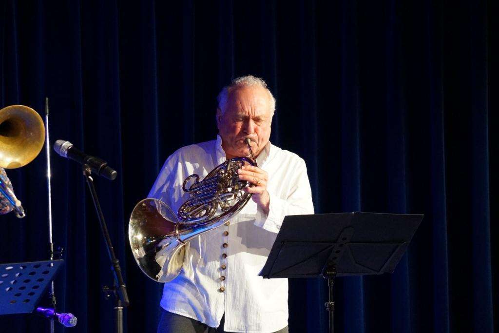 Gemeinsam mit ihrem musikalischen Freund, dem Hornisten Peter Arnold, lädt sie zu einem kabarettistischen Konzert ein