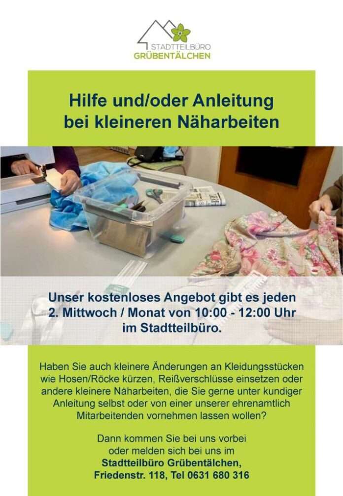Am Mittwoch, den 8. Mai, von 10:00 – 12:00 Uhr bietet das Stadtteilbüro Grübentälchen wieder die Möglichkeit, kleinere Änderungen an Kleidungsstücken wie Hose/Rock kürzen, Reißverschlüsse einsetzen oder andere kleinere Näharbeiten unter kundiger Anleitung selbst oder von einer ehrenamtlich Mitarbeitenden vornehmen zu lassen.