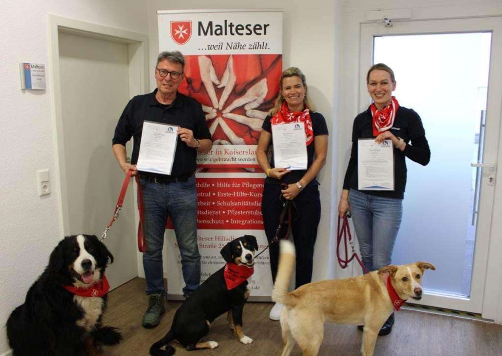 Nach intensiver Vorbereitung freuen sich 4 neue Hundebesuchsteams auf ihren ersten Einsatz. Beim „Besuchsdienst mit Hund“, einem Angebot des Malteser Hilfsdienstes, treffen Ehrenamtliche mit eigenem Hund auf ältere oder pflegebedürftige Menschen.