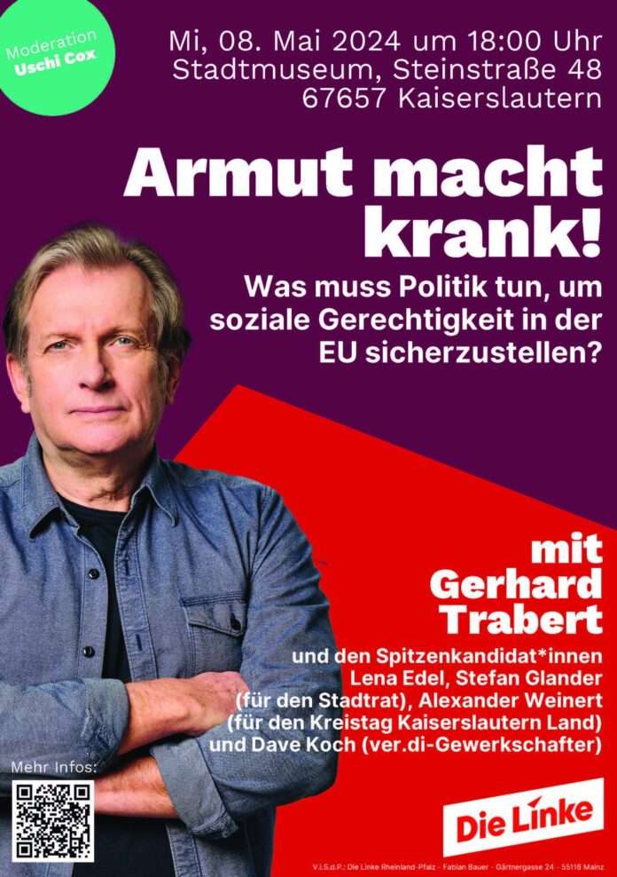 Gerhard Trabert, Sozialmediziner, Gründer des Vereins “Armut und Gesundheit” und Kandidat für die Europawahl, diskutiert mit Stefan Glander und Lena Edel, Spitzenkandidat*innen für den Stadtrat, Dave Koch, ver.di-Gewerkschafter, zuständig für die Erwerbslosen, sowie Alexander Weinert, Spitzenkandidat für den Kreistag Kaiserslautern. Die Moderation übernimmt Uschi Cox. Es wird Getränke und Snacks geben.