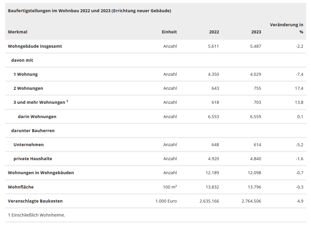 Die Wohnfläche lag insgesamt bei 1,38 Millionen Quadratmetern und damit in etwa auf dem Wert des Vorjahres. Die durchschnittliche Wohnfläche pro fertiggestellter Wohneinheit entsprach in 2023 mit 114 qm ebenfalls dem Vorjahresniveau (113 qm). Die veranschlagten Baukosten betrugen insgesamt 2,76 Milliarden Euro. Damit stiegen die durchschnittlich veranschlagten Baukosten pro Wohneinheit um 5,7 Prozent von rund 216.000 Euro in 2022 auf rund 229.000 Euro im Jahr 2023.