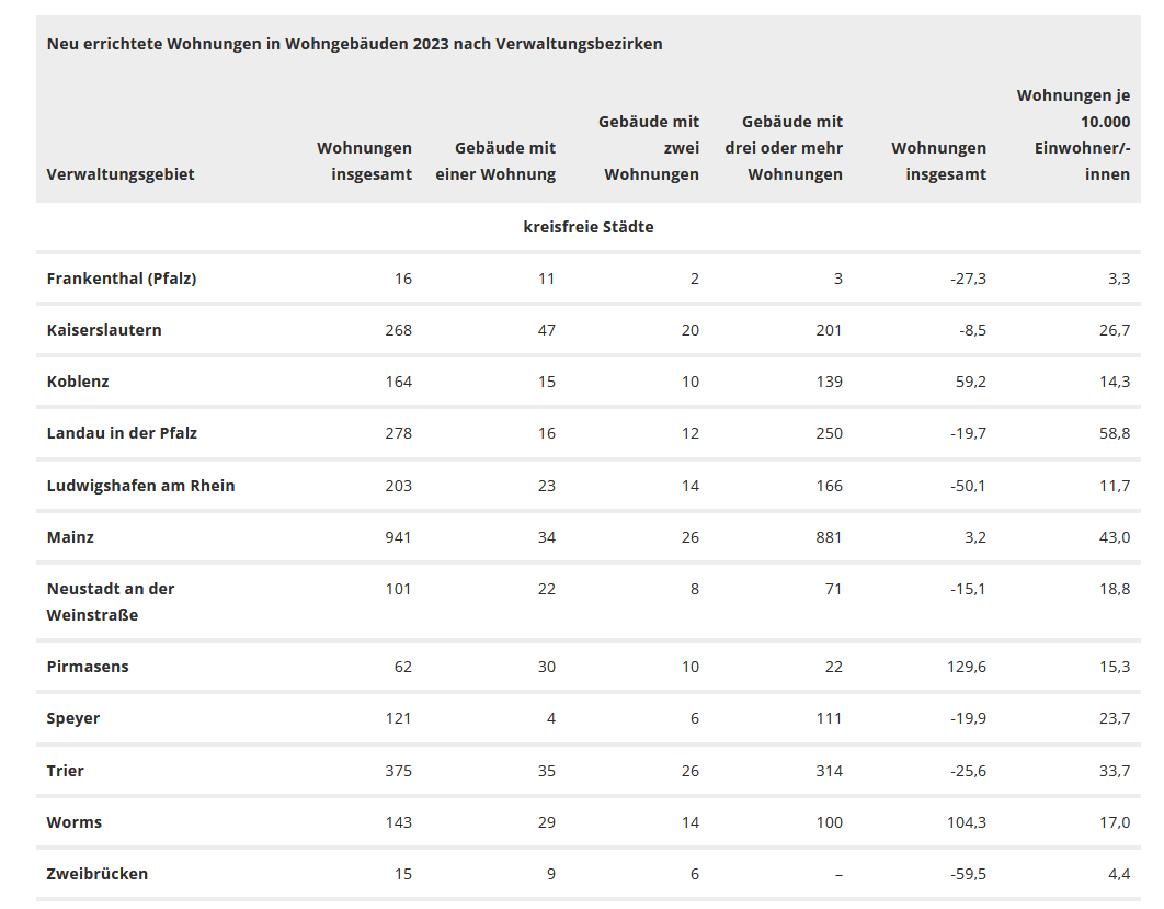 Landesweit wurden im Neubau etwa 29 Wohnungen je 10.000 Einwohnerinnen und Einwohner fertiggestellt – mit Unterschieden zwischen den Landkreisen (31 Wohnungen) und den kreisfreien Städten (25 Wohnungen). Die meisten Wohnungen je 10.000 Einwohnerinnen und Einwohner wurden mit knapp 59 in der kreisfreien Stadt Landau fertiggestellt, die wenigsten in Frankenthal mit rund drei Wohnungen. In den Landkreisen fiel die Spreizung etwas geringer aus: Mit 58 fertiggestellten Wohnungen lag der Eifelkreis Bitburg-Prüm hier an der Spitze und der Kreis Kaiserslautern mit 12 an letzter Stelle.