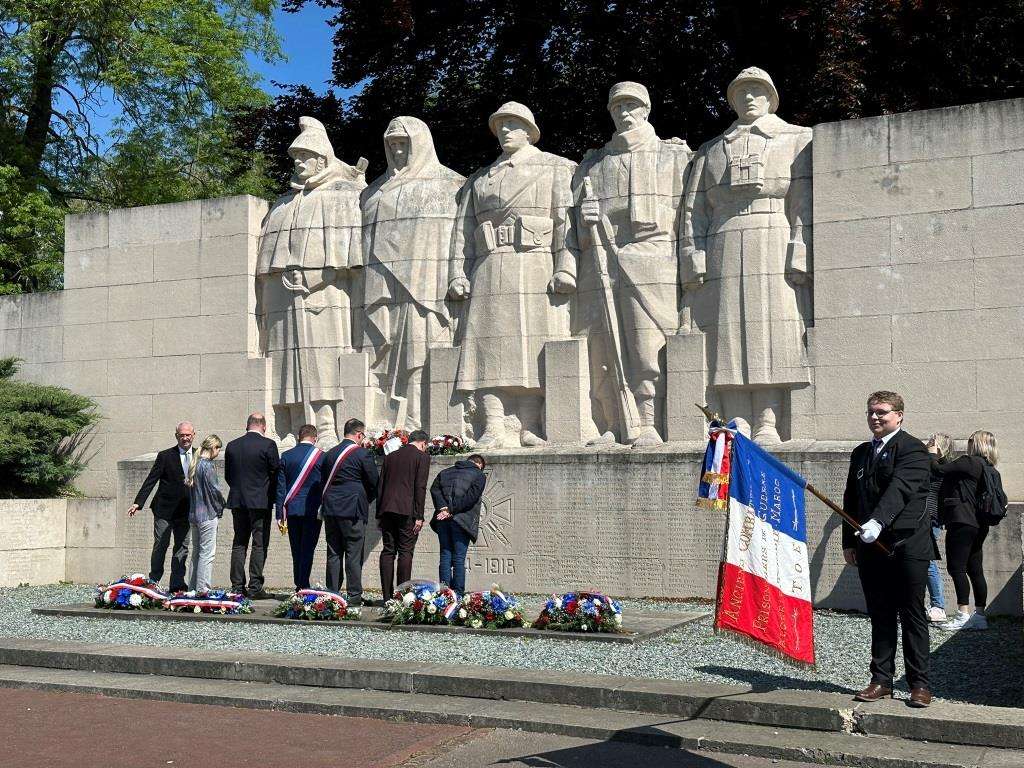 Verdun wurde daher erneut als Ort der Begegnung von Vertreterinnen und Vertretern aus den Stadträten, den Jugendvertretungen und Verwaltungen beider Städte für ein Treffen ausgewählt. Organisiert von Europe Direct Kaiserslautern und der Stadt, tauschten sich die Teilnehmerinnen und Teilnehmer vier Wochen vor der Europawahl über die Zukunft der Europäischen Union aus. Weitere Themen waren die Erinnerungsarbeit und im Vorfeld der olympischen Spiele auch die Diskussion um die Bedeutung des Sportbereiches für die europäische Einheit. Nach einer geführten Besichtigung der Schlachtfelder von Douaumont und des Beinhauses, begrüßte der Bürgermeister der Stadt Verdun, Samuel Hazard die deutsch-französische Gruppe. Im Rahmen einer Kranzniederlegung am „Monument aux Morts“ in Verdun durch Alexis Grandin, stellvertretender Bürgermeister von Saint-Quentin, und Jörg Harz, Mitglied des Stadtrats der Stadt Kaiserslautern, stellte Samuel Hazard den diesjährigen Europatag am 9. Mai und die Bedeutung vielfältigen Engagements für die Zukunft Europas in den Mittelpunkt seiner Ausführungen. Er verwies vor dem Hintergrund der gemeinsamen deutsch-französischen Erinnerungsarbeit auf aktuelle Herausforderungen in den Aufgabenbereichen von Städten, insbesondere angesichts der Zunahme nationalistischer Strömungen. Alexis Grandin und Jörg Harz schlossen sich in ihren Wortbeiträgen diesen Ausführungen vollumfänglich an. Ihren Abschluss fand die bilaterale Begegnung in einer geführten Gedenkradtour in und um Verdun.