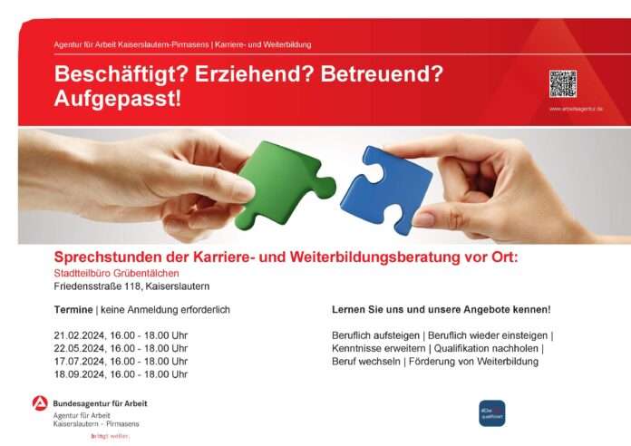 Das Stadtteilbüro Grübentälchen (Tel 0631 680 316 90), Friedenstr. 118, lädt wieder ein zur Sprechstunde der Bundesagentur für Arbeit am Mittwoch, 22. Mai, von 16:00 – 18:00 Uhr zu den Themen „Beruflich wieder einsteigen / beruflich aufsteigen / Kenntnisse erweitern / Qualifikation nachholen / Beruf wechseln / Förderung von Weiterbildung“. Es ist keine Anmeldung erforderlich.