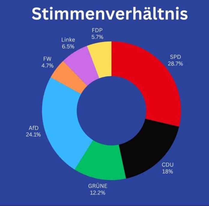 Dabei erhielten wir aus den 1231 abgegebenen Stimmen folgendes Ergebnis: SPD (28,7%), AFD (24,1%), CDU ( 18%), Grüne (12,2%), Linke (6,5%), FDP (5,7%), FW (4,7%).