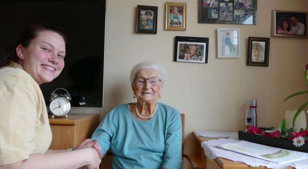 Rosa Galwas fühlt sich wohl im Kursana Domizil und ist dankbar für die Unterstützung der Pflegerinnen und Betreuerinnen, wie hier im Bild Annika Schuff, zu denen sie eine herzliche Beziehung hat.